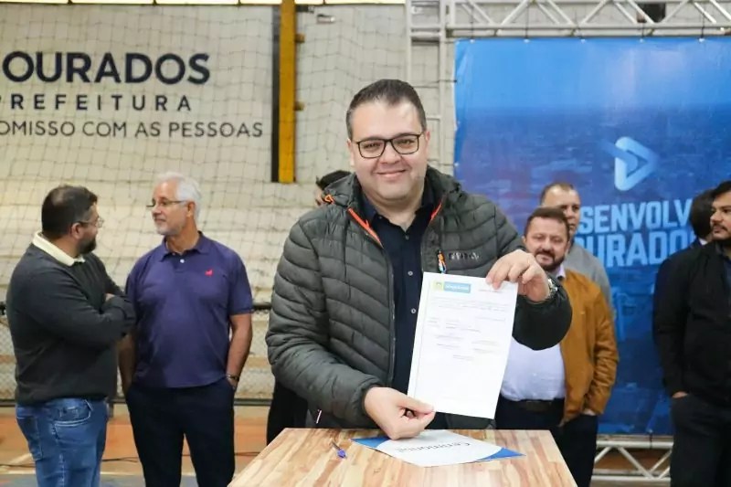 O prefeito de Dourados, Alan Guedes, assinou nesta segunda-feira (12), a ordem de serviço para execução de bases de arenas esportivas. Serão 6 arenas do programa “MS Bom de Bola”, que acontece através de um convênio com o governo do Estado.