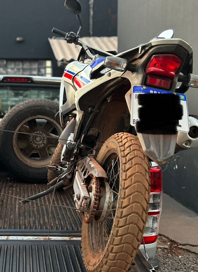 Um deles ainda tinha ocultada em outra de suas casas uma motocicleta Honda/XRE 300 roubada com emprego de arma de fogo na cidade de Cuiabá/MT no último mês de junho. O veículo se encontrava com a placa de identificação adulterada quando foi localizado.