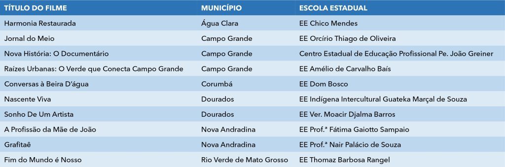 A SED (Secretaria de Estado de Educação) divulgou a lista dos 10 curtas selecionados pelo juri técnico que disputarão a fase final do I Festival de Cinema das Escolas Estaduais de MS – Prêmio “Joel Pizzini”, que serão exibidos na tarde de premiação no dia 18 de outubro, das 14 às 17h, no Museu da Imagem e do Som, em Campo Grande.