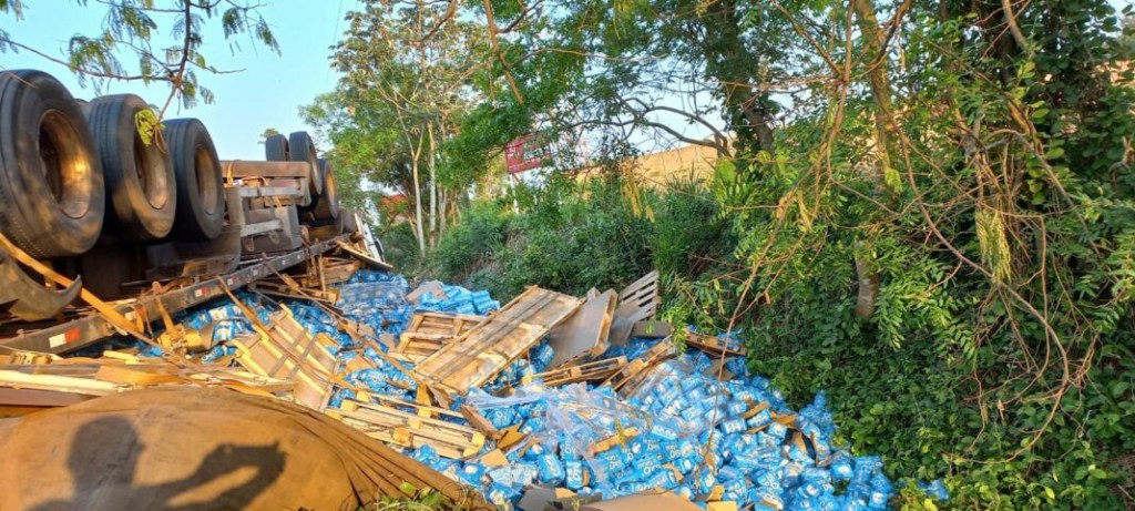 Uma carreta tombou e esparramou toda a carga de cerveja na manhã desta segunda-feira (2) em Dourados. O acidente ocorreu na rotatória do anel viário, entroncamento com a rua dos Caiuás.
