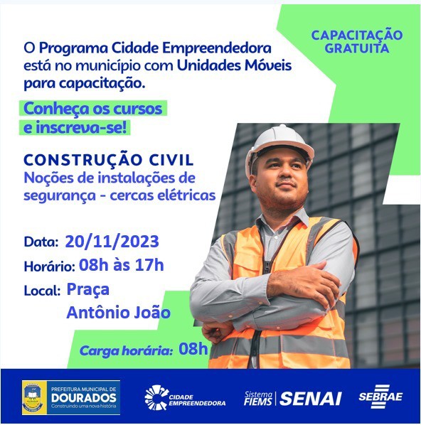 A Prefeitura de Dourados, em parceria com o Sebrae-MS, Sistema Fiems e Senai, promove uma série de cursos de capacitação na área de Construção Civil entre os dias 20 e 27 de novembro. Por meio do programa Cidade Empreendedora, uma unidade móvel do Senai vai estar na Praça Antônio João, as matrículas para participar acontecem nos Cras (Centro de Referência de Assistência Social) e estão abertas para homens e mulheres maiores de 18 anos, com ou sem inscrição no Cadastro Único.