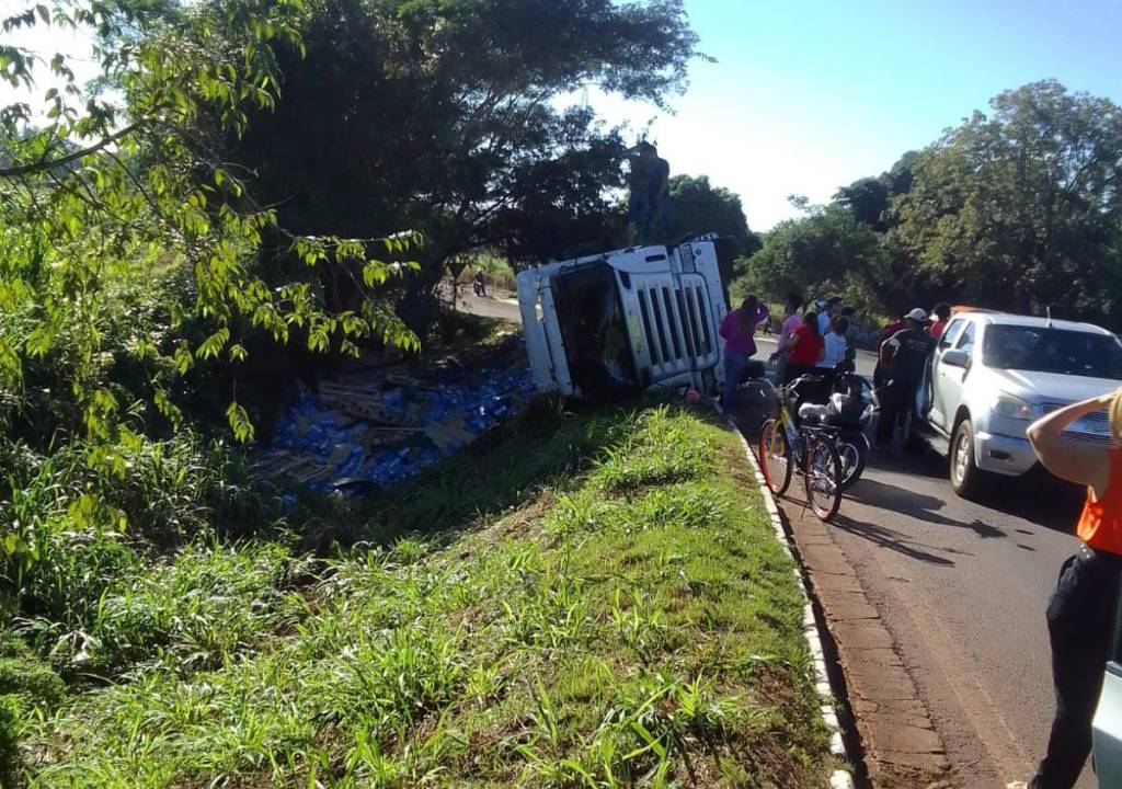 Uma carreta tombou e esparramou toda a carga de cerveja na manhã deste sábado (20) em Dourados. O acidente ocorreu na rotatória do anel viário, entroncamento com a rua dos Caiuás.