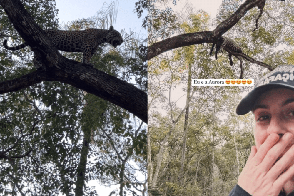 “A Aurora é muito especial pra gente, foi incrível, fazia muito tempo que eu não via ela. Ela simplesmente veio na nossa direção, passou do nosso ladinho, entrou no mato, começou a esturrar, que é a vocalização das onças, depois subiu na arvore, num pé de tarumã, e aí ela ficou muito pertinho da gente, e ela ficou lá, assim, deitada por bastante tempo”, conta.