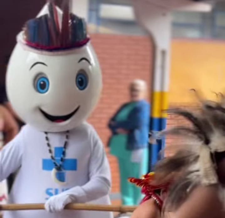 No entanto, quem roubou a cena e encantou a todos foi a presença ilustre do Zé Gotinha. O personagem símbolo da vacinação chegou com energia contagiante e, para a surpresa e alegria dos presentes, uniu-se ao grupo de dança tradicional Terena. Em um momento de grande integração cultural, o Zé Gotinha chegou a usar um cocar e arriscou passos junto com os dançarinos, demonstrando de forma lúdica e respeitosa a importância da vacinação para a proteção da comunidade, em especial das crianças.