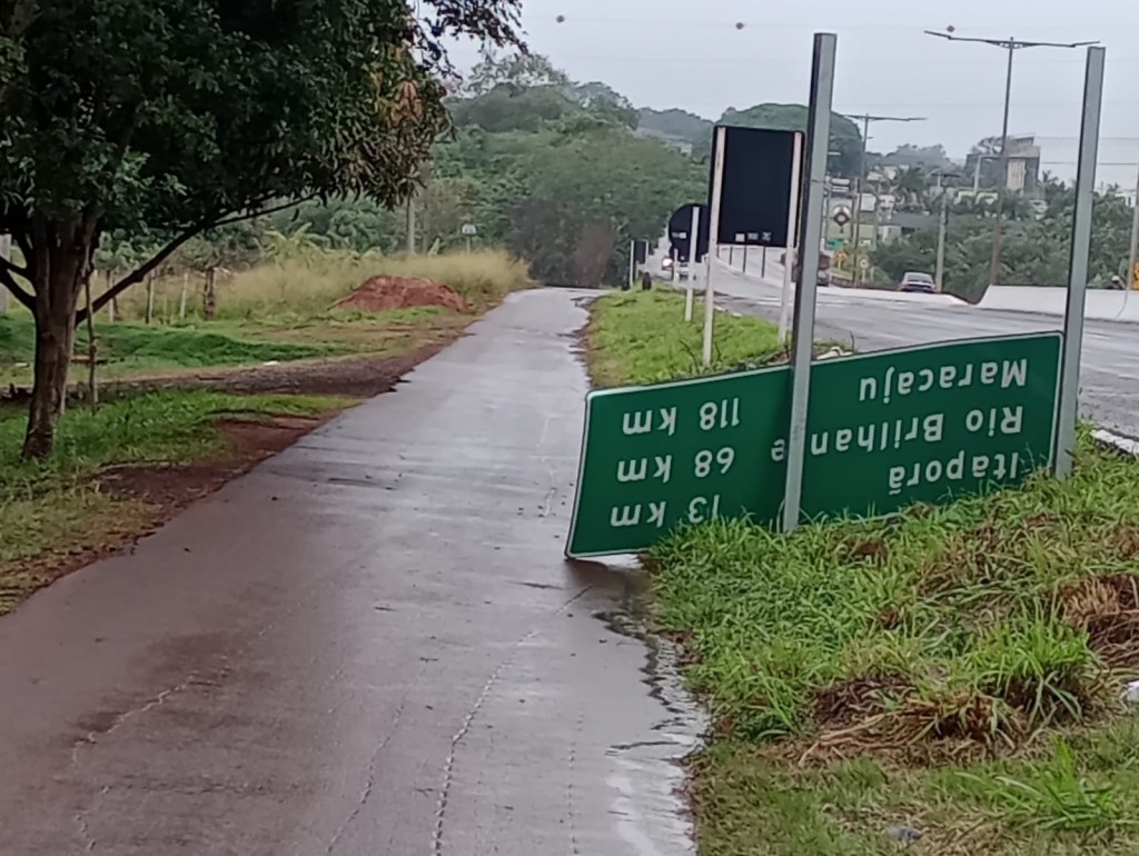Moradores e motoristas que trafegam pela rodovia MS-156, na altura da Aldeia Jaguapiru, estão enfrentando um transtorno e um risco no caminho. Uma placa de sinalização estadual está caída às margens da pista, ocupando parte do acostamento e do asfalto, obrigando os usuários a desviar do obstáculo.