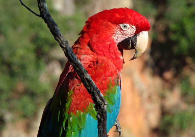Uma arara-vermelha foi resgatada nesta semana pela Polícia Militar Ambiental (PMA) de Dourados, depois de colidir contra a vidraça de uma residência e ficar desorientada no jardim.